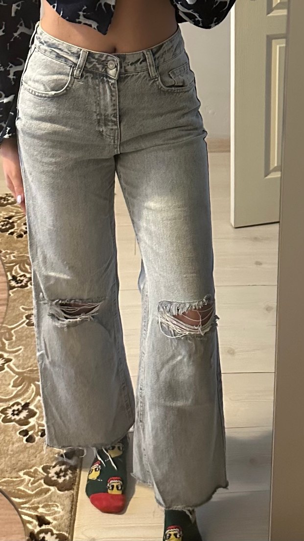 Bağcıklı detaylı, gri tie-dye efektli geniş kesim midi boy denim pantolon. Yırtık dizleriyle sokak tarzı, günlük kullanıma uygun.