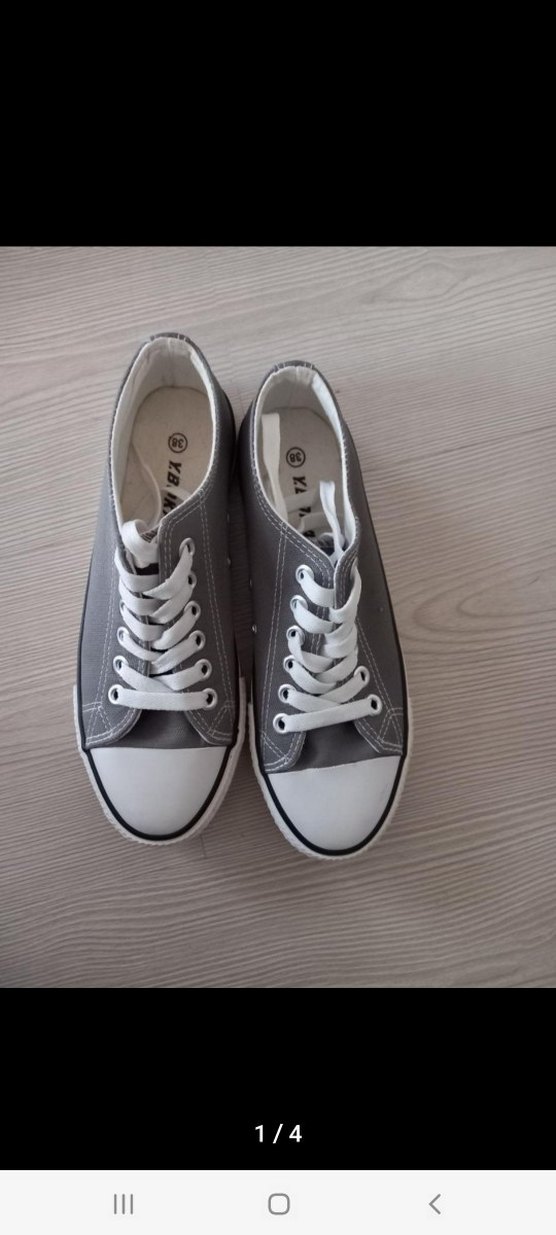 Gri bağcıklı kadın spor ayakkabısı, kauçuk tabanlı ve ince topuklu, günlük sokak stiline uygun desensiz tasarım. yalnızca 1 kez giyildi