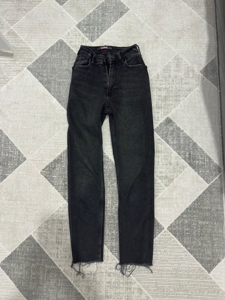 Gri tonlarında, bağcıklı detaylı, normal boyda, rahat kesim kadın denim pantolon. Günlük kullanıma uygun, casual tarzda.