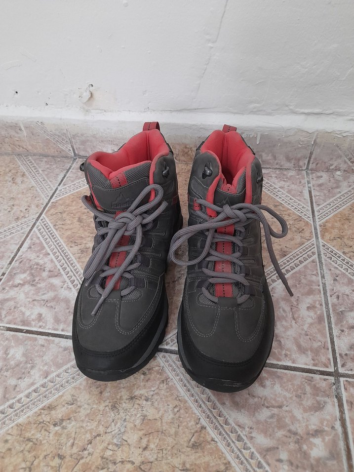 Gri bağcıklı kadın outdoor ayakkabılar, kauçuk tabanlı, kar için ve rahat kullanım için uygundur. Dış mekan aktiviteleri için konforludur.