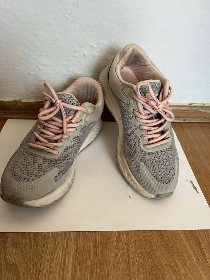 Gri bağcıklı kadın spor ayakkabısı, kauçuk tabanlı ve sokak stili. Spor ve günlük kullanıma uygun, stilettolu topuk şekline sahip, desensiz ve trend.