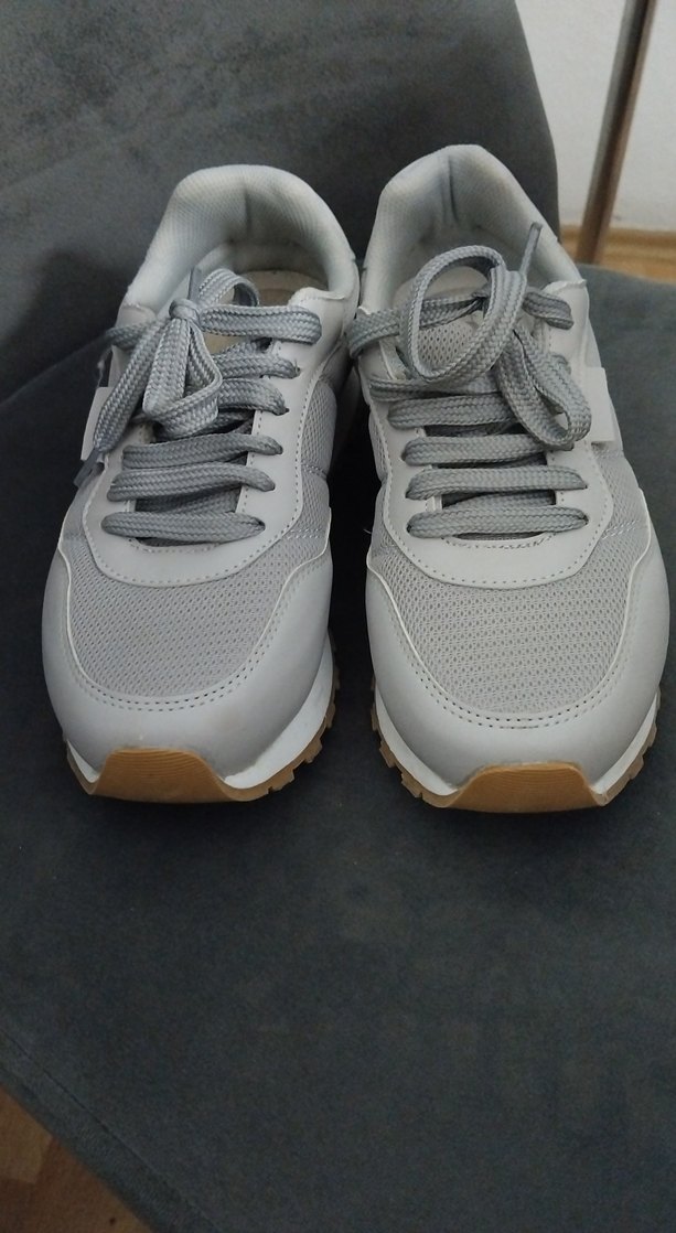 Gri bağcıklı, kauçuk tabanlı kadın spor ayakkabısı. Sokak modası ve spor için uygundur.