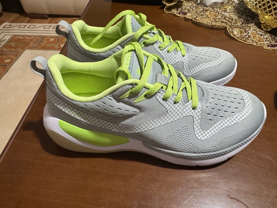 Gri file üst yüzeye sahip, neon yeşil bağcık ve astarlı kadın spor ayakkabısı. Hafif kauçuk tabanlı, çağdaş tarzda ve rahat bir yapıya sahiptir.