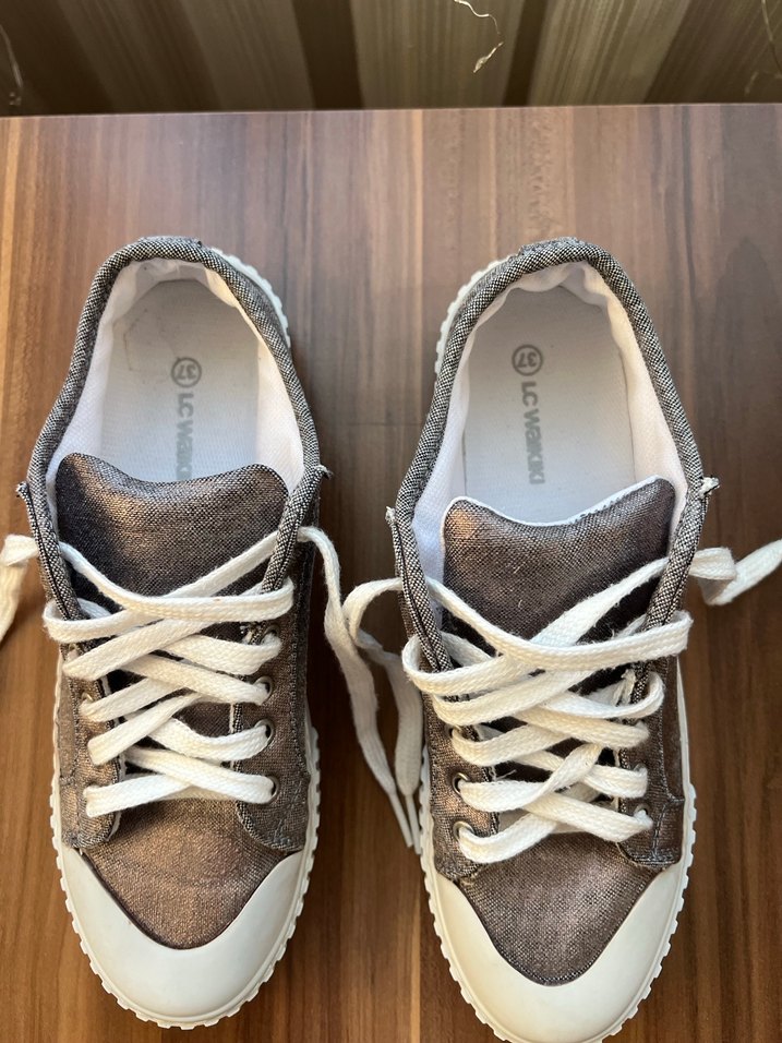 Gri renkli, bağcıklı kadın spor ayakkabısıdır. Günlük kullanıma uygundur ve 'LC' logosu bulunur.
