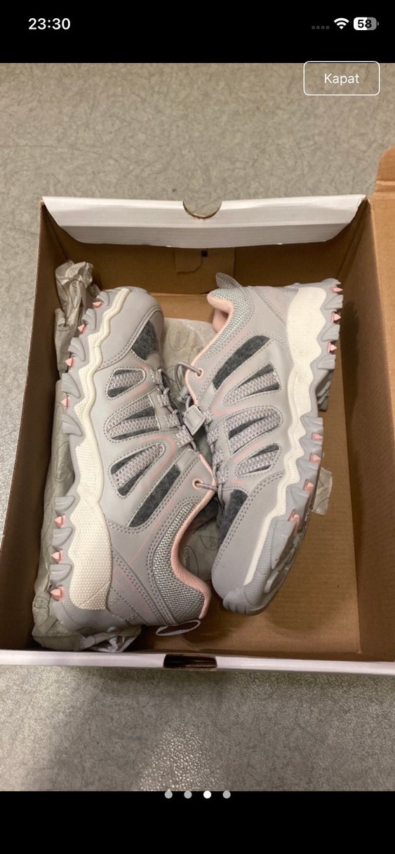 Gri renkli, bağcıklı ve yüksek tabanlı kadın spor ayakkabısıdır. Dış mekan kullanımı için uygundur ve sokak modasına uygundur.