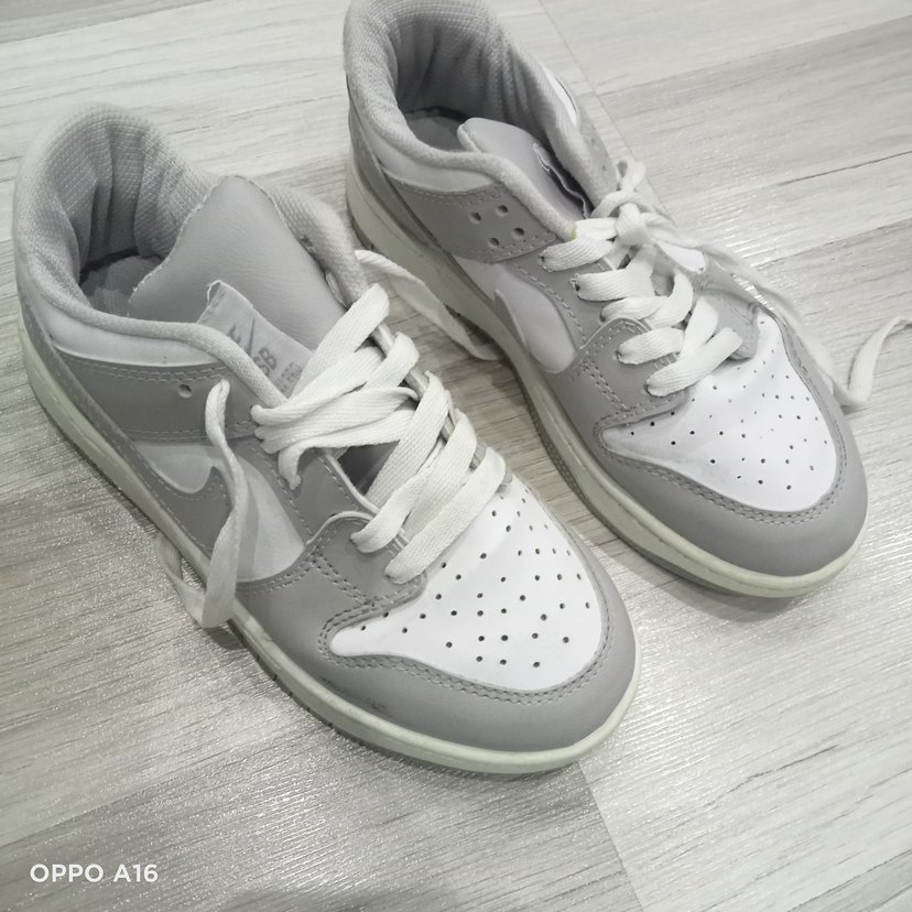 Gri ve beyaz renkte, bağcıklı tasarıma ve ince topuklu kauçuk tabana sahip kadın spor ayakkabısı. Spor ve sokak stili için uygundur.