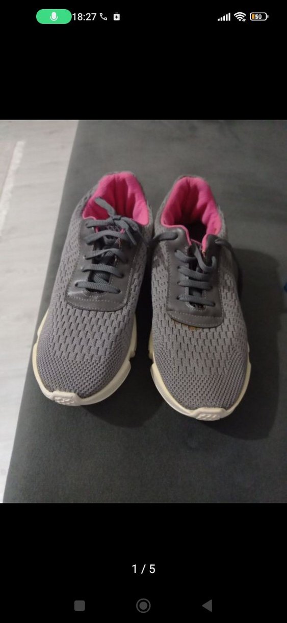 Gri nefes alan üst yüzeyi ve bağcıklı tasarımıyla kadın spor ayakkabısı. İç kısmı pembe renkte, stilettolu topuklu ve sokak modasına uygun.son fotoda lekesi var başka hiçbir sorunu yok yenidir hiç giyilmedi