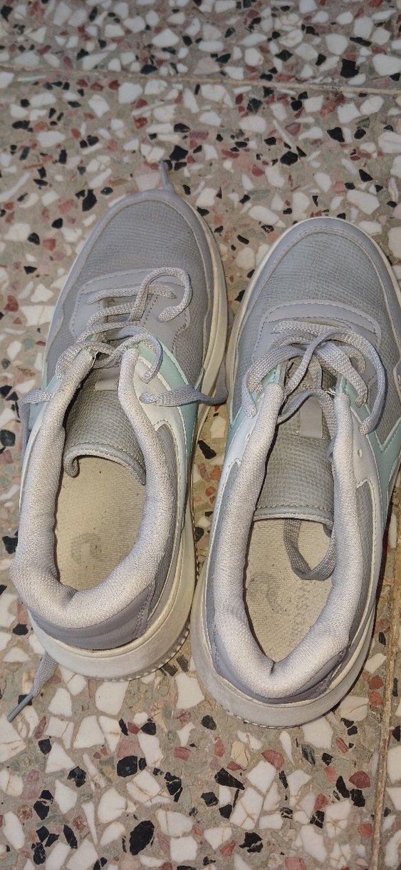 Gri renkli, bağcıklı kadın spor ayakkabısı, kauçuk tabanlıdır ve sportif sokak stiline uygundur.