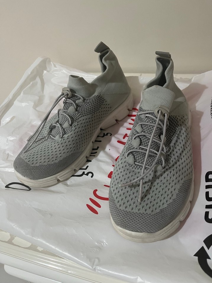 Gri renkli, nefes alabilen dokuma üst yüzeye sahip, bağcıklı ve düz tabanlı kadın spor ayakkabısı. Rahat sokak stili için uygundur. ♀️aşırı temiz kullanılmadı gibi birşey defosu yok dikişleri sapasağlam. 37 numara . Çok hafif ayakta yok denecek kadar . Alan güle güle giysin.