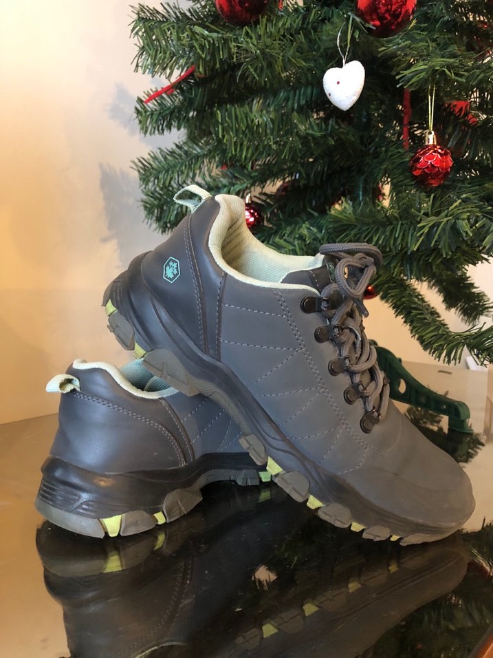 Gri renkli, bağcıklı ve baskılı detaylara sahip Kadın spor outdoor ayakkabısı. Kauçuk malzemeden üretilmiş, spor ve sokak stiline uygun.