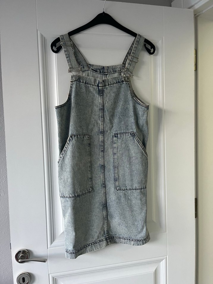 Gri bağcıklı askıları ve bağlama detaylarıyla bol kesim kısa kot tulum, ön cepler ve straplez yakasıyla rahat sokak stili için uygun.