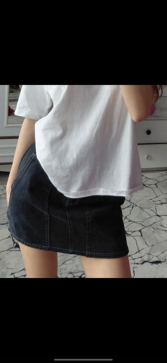 Gri renkli, bağcıklı bel ve batik desenli bol kesim midi uzunlukta denim etek. İki ön cep bulunur, rahat sokak stili için uygundur.