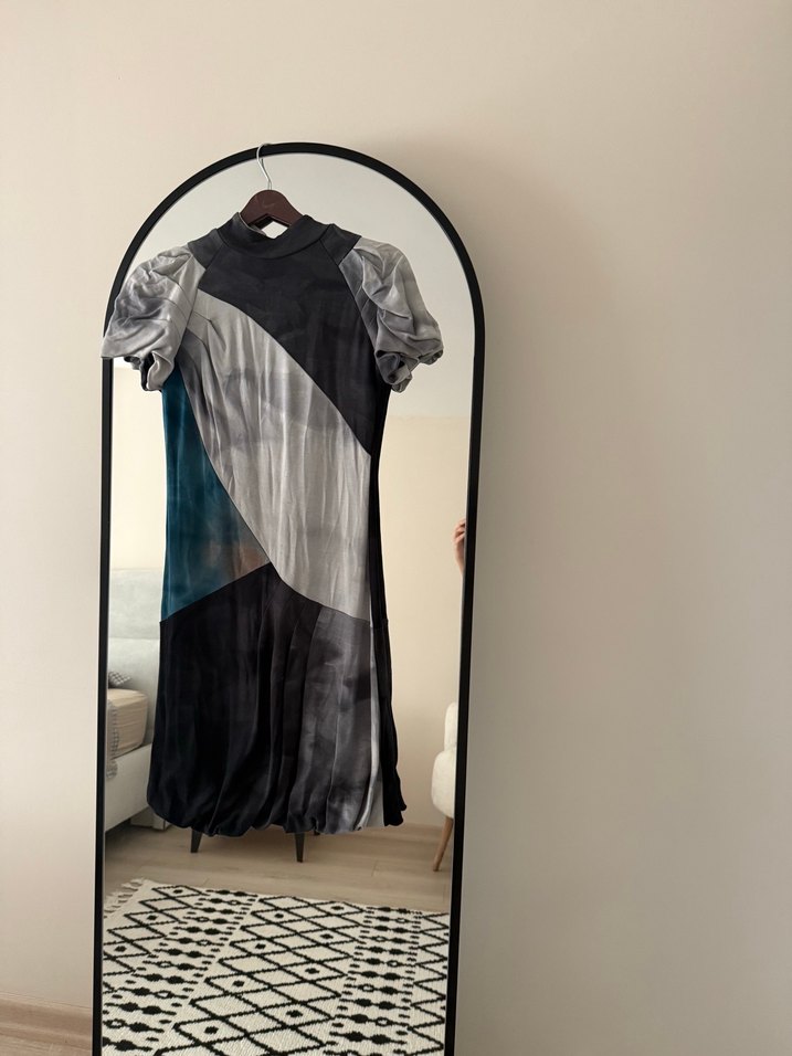 Yurtdışından alındı,Yumuşak sentetik kumaştan uzun, bol kesim elbise. Yüksek yakalı, kısa kollu, gri batik desenli ve drapeli tasarımıyla çağdaş bir stil sunar.