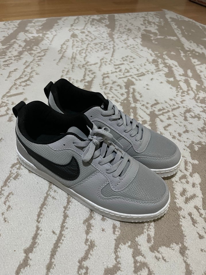 Nike marka, bağcıklı, gri renkte, desensiz spor ayakkabı. Kauçuk tabanlı, sportif ve rahat bir tasarım sunar.