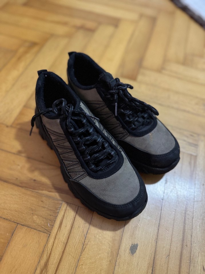 Gri, bağcıklı ve desensiz tasarıma sahip erkek outdoor ayakkabısı, günlük rahat kullanım için uygundur. 36 numara