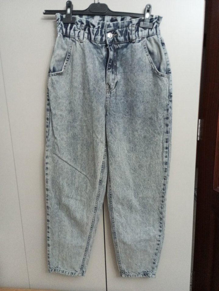 Gri denim kumaştan salaş kesim, bağcıklı bel ve batik desenli kadın kot pantolon. Midi boy, günlük sokak stili için uygundur.