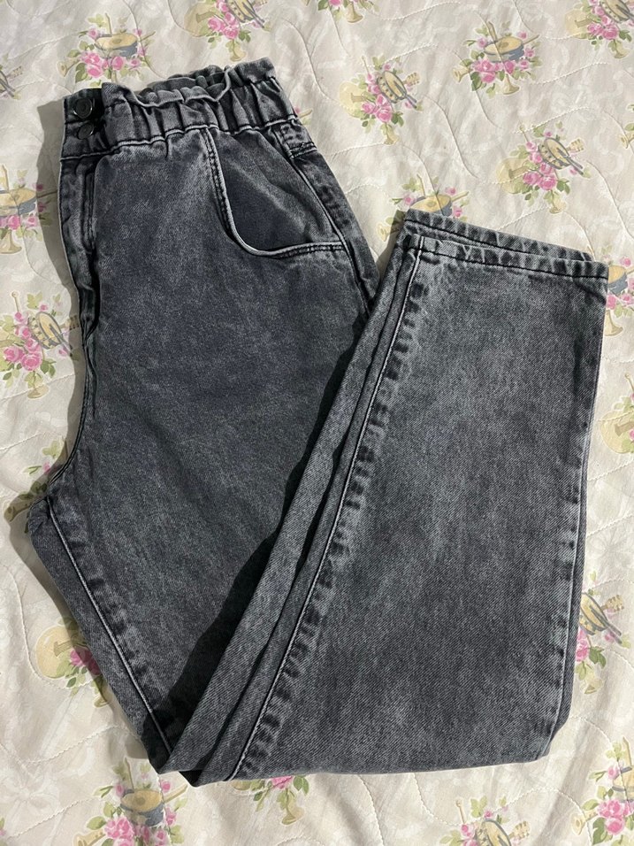Gri denim kumaştan, bağcıklı bel ve salaş kesime sahip kot pantolon.
