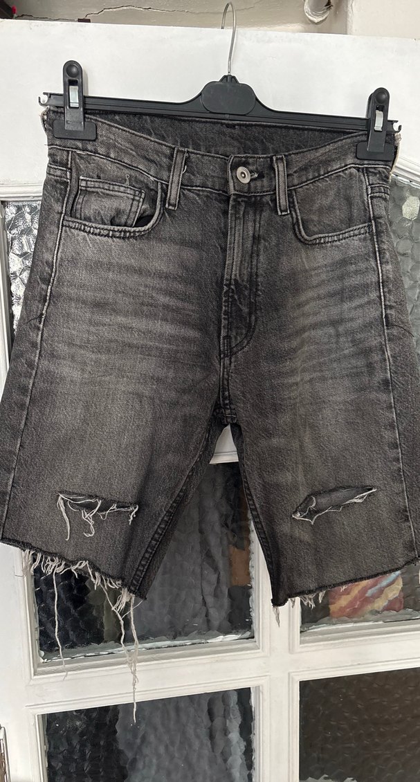 Gri bağcıklı, salaş kesim mini denim şort. Yıpratılmış detaylar ve tie-dye deseniyle günlük rahat sokak stili için uygun.
