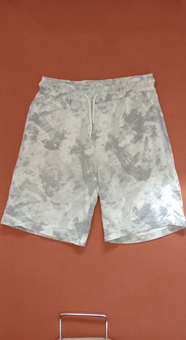 Gri renkli tie-dye desenli, bol kesim ve bağcıklı elastik bel bandına sahip şort. Yumuşak sentetik kumaştan üretilmiş, rahat ve şık bir sokak stili sunar.