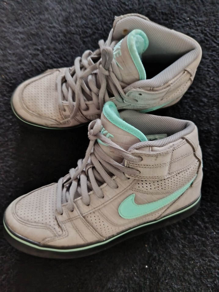 orjinal Nike Gri renkte, bağcıklı ve dolgu topuklu unisex spor ayakkabısı kullanılmıştır fakat iyi durumda 38,5 no