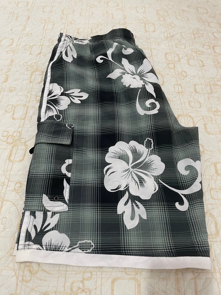 Gri renkli, uzun ve bol kesim erkek mayo, bağcıklı detaylara sahip. Çiçek desenli ve tie-dye tarzıyla bohem bir görünüm sunar.