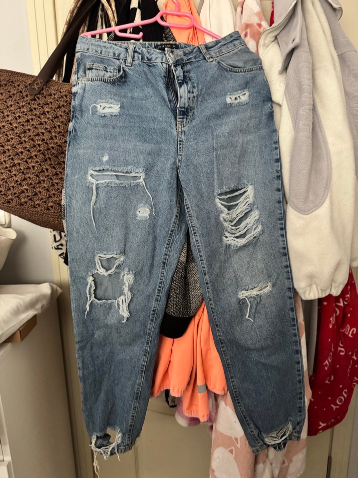 Gri bağcıklı, yırtık detaylı midi boy kadın denim pantolon. Rahat kesimi ve günlük kullanıma uygun tarzıyla dikkat çeker.