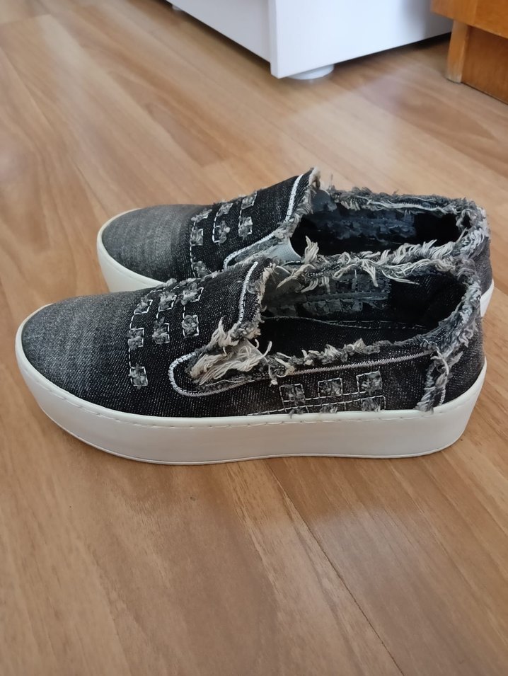Gri batik desenli denim üst yüzey, tırtıklı kenar ve platform topuklu kadın spor ayakkabısı. Tokalı kayış ve kalın beyaz tabana sahip, sokak stili için uygun.