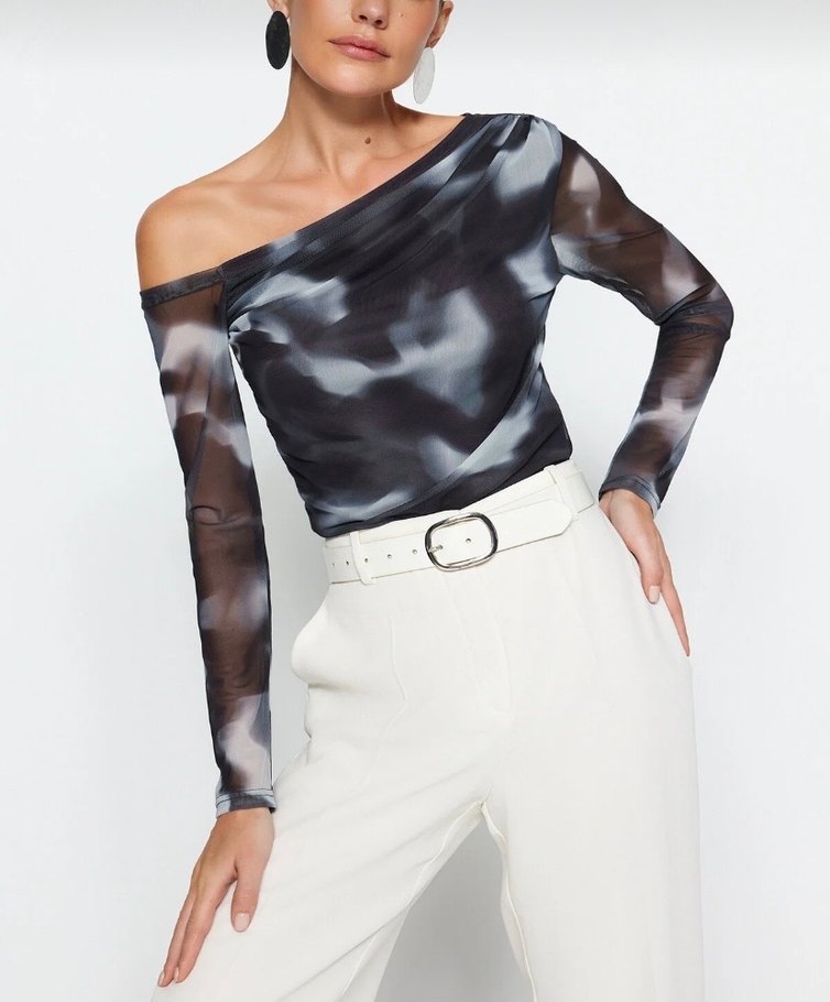 Gri tonlarında bağlama desenli, askısız ve asimetrik kesim bluz. Uzun, ince askılı kolları ve drapeli, bol kesimiyle modern bir tarz sunar. ✨