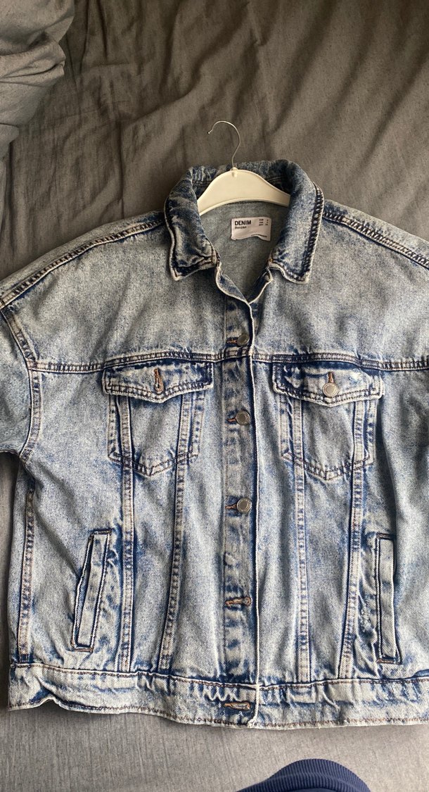Gri bağlama desenli, düğmeli, bol kesim kadın kot ceket. Notlu yaka ve uzun kollu, günlük rahat sokak stili için uygun.