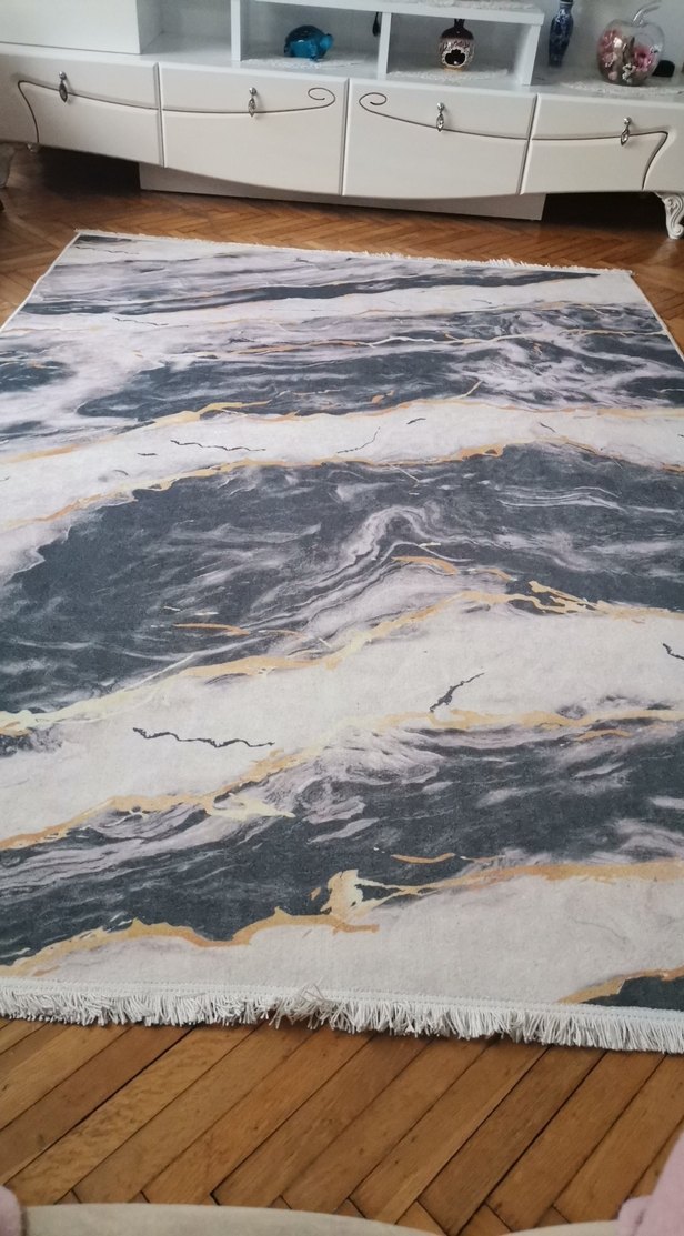 Gri bağlama desenli çağdaş halı, bej tonlarında ince detaylarla zarif bir görünüm sunar. Püsküllü kenarları ve yumuşak dokusuyla modern mekanlara uygundur. Füme-sarı-altın sarısı-krem