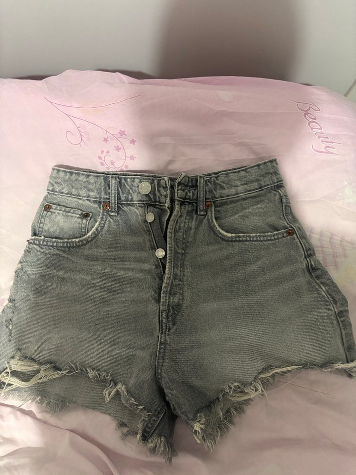 Gri bağlama desenli, düğmeli kadın mini denim şort. Bol kesim ve kısa boy, uçları tırtıklı, gündelik grunge punk tarzına uygun.