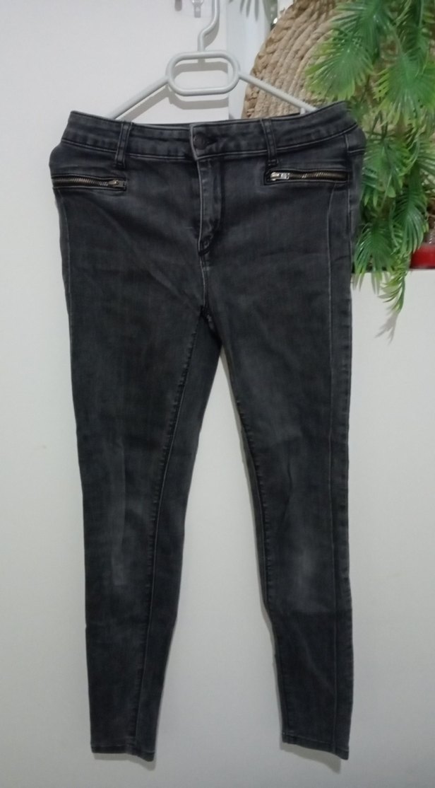 Gri bağlama desenli, fermuarlı cepleri olan dar kesim kot pantolon. Midi boy ve sokak stili, günlük kullanıma uygun grunge punk havası verir.