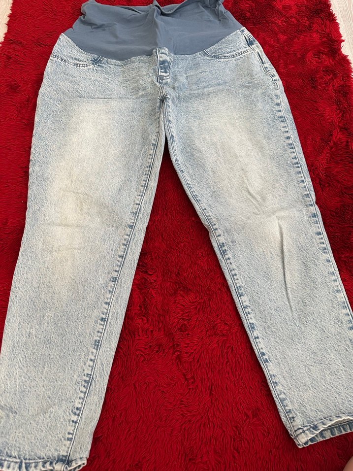 Gri bağlama desenli, düğmeli detaylı, mom jean kesim hamile kot pantolon. Rahat esnek bel bandı ile günlük kullanıma uygundur.