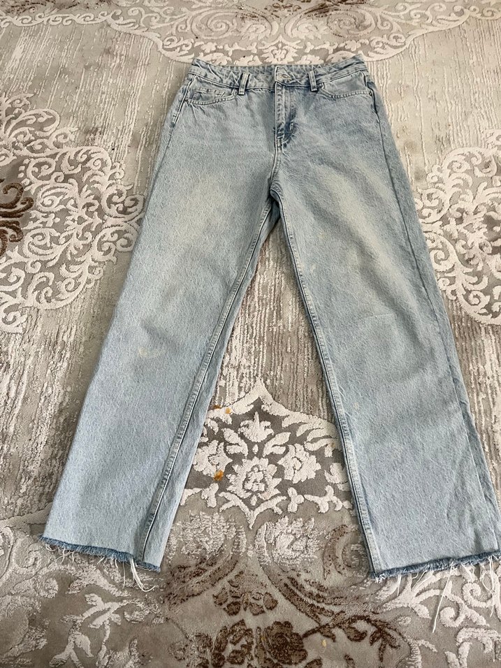 Gri bağlama desenli, bol kesim kadın kot pantolon. Midi boyda, rahat ve gündelik stil için uygun.
