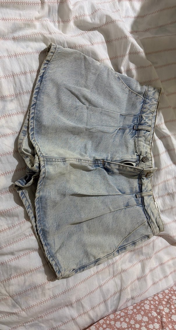 Gri kot şort, bol kesim, pile detaylı ve bağlama desenli, günlük sokak tarzı için uygun.