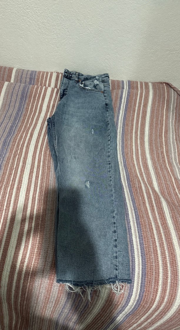 Gri bağlama desenli, yırtmaç detaylı, bol kesim midi uzunlukta kadın denim pantolon. Günlük sokak tarzı için uygun ve rahat.