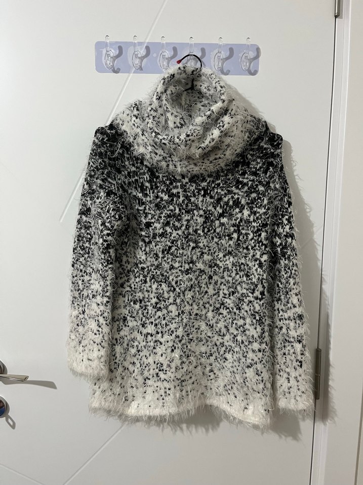Gri bağlama desenli triko, kürk detaylı boğazlı yaka ve uzun kollu, midi boy, bol kesim rahat ve modern tarzda kazak. Boy59cm göğüs 92cm