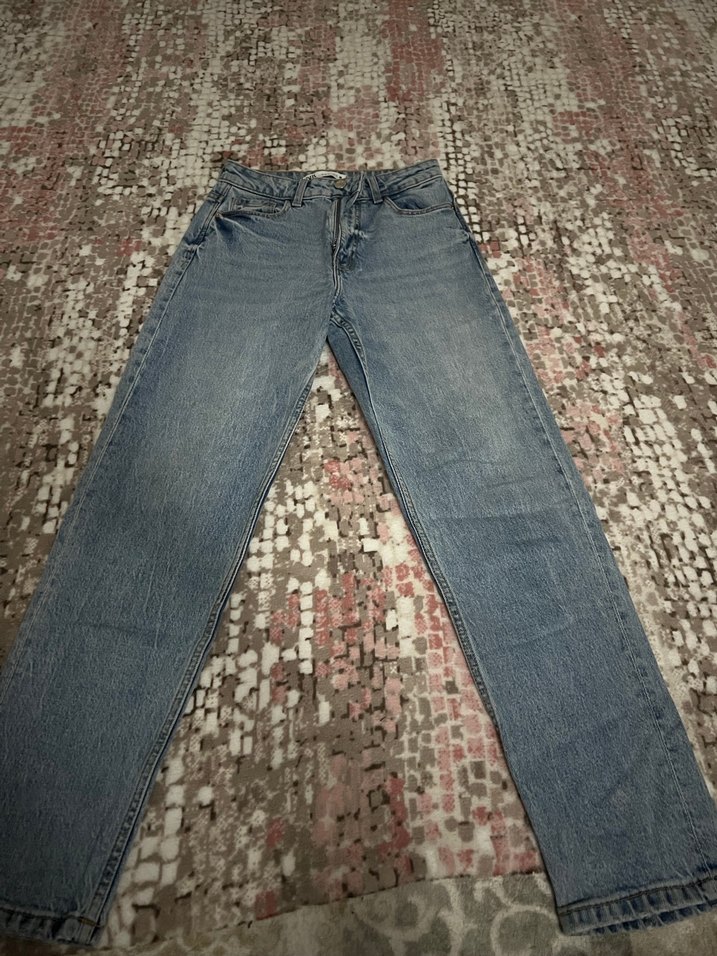 Gri bağlama desenli, midi boy, bol kesim kot pantolon, rahat ve şık günlük kullanım için idealdir.