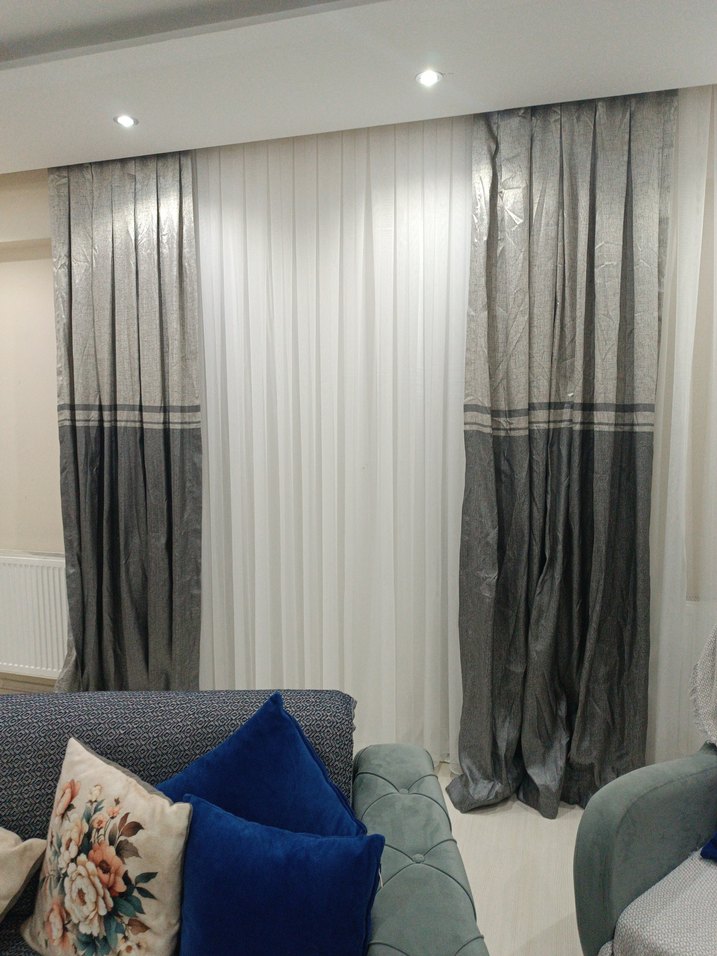Gri bağlama desenli modern klasik tarzda, odaya zarif ve dokulu bir görünüm katan perdeler. ️