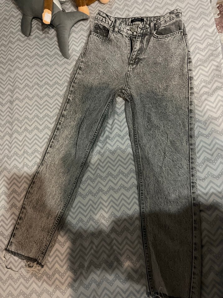 Gri bağlama desenli denim kot pantolon, regular fit ve normal boyda. 34 beden, rengi fotoğraftakinden bir tık daha açık ve dar kalıp