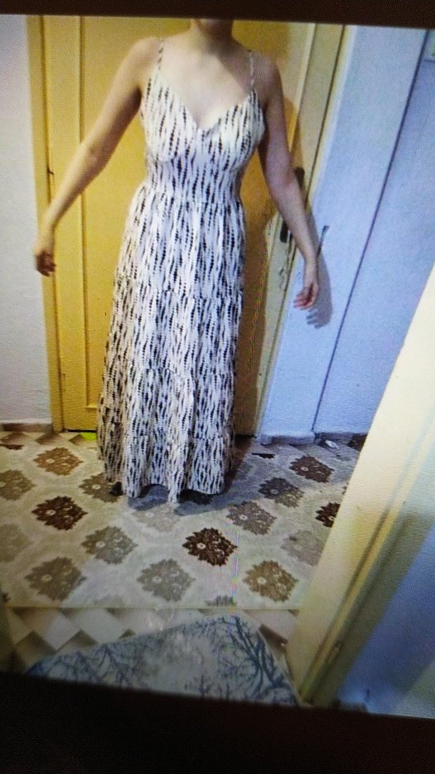 Bu uzun, vücuda oturan kadın elbise gri bağlama desenli ve drapeli. V yaka ve kolsuz, yumuşak sentetik kumaştan bohem tarzda.
