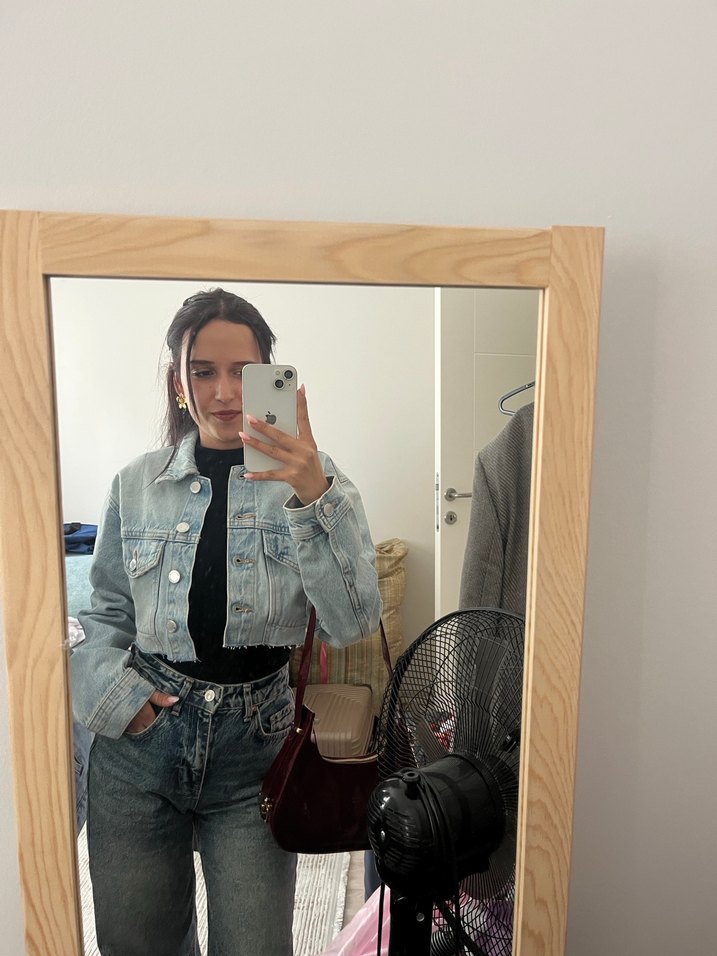Gri bağlama desenli denim ceket, yüksek yakalı ve bol kesimdir. Uzun kollu ve normal boyda, günlük kullanım için uygundur. Sokak modasına uygun rahat şıklık sağlar.