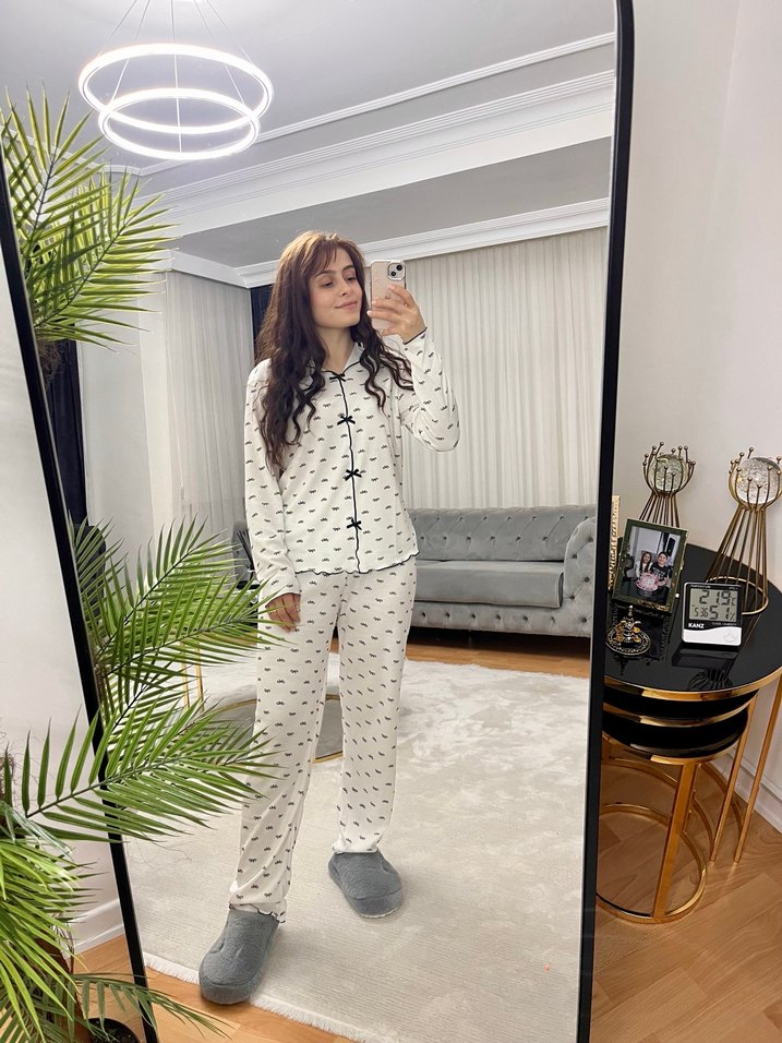 Kadın pijama takımı, bol kesim, uzun kollu ve midi boyda. Beyaz zemin üzerine gri bağlama desenleriyle rahat ve normcore tarzda konfor sunar.