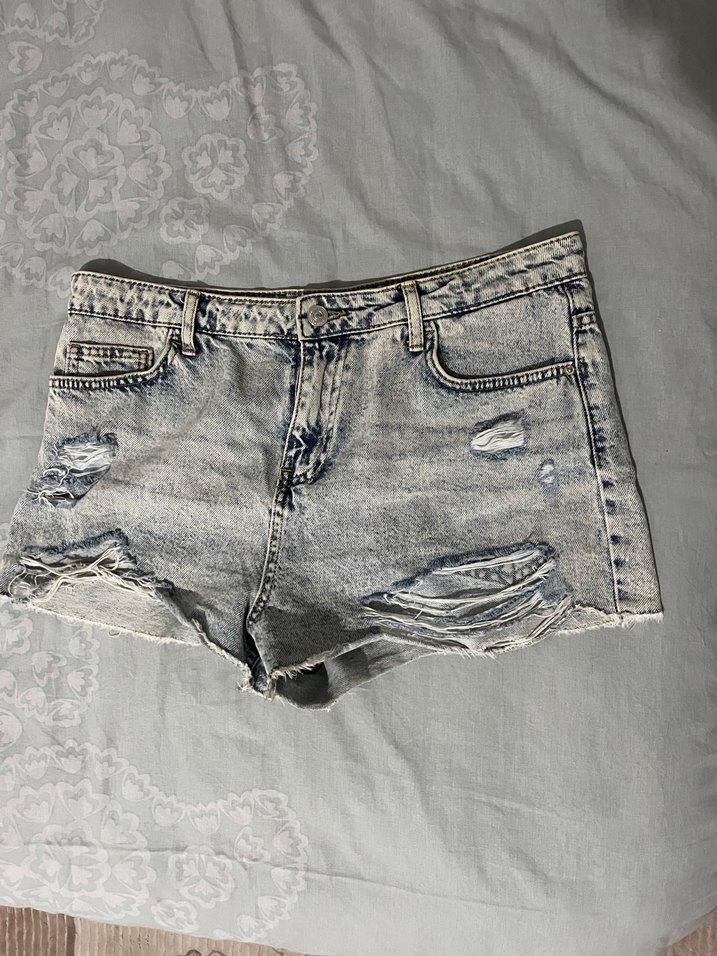 Gri bağlama desenli, yırtık detaylı mini kot şort, rahat ve salaş kesimiyle gündelik sokak stiline uygun.