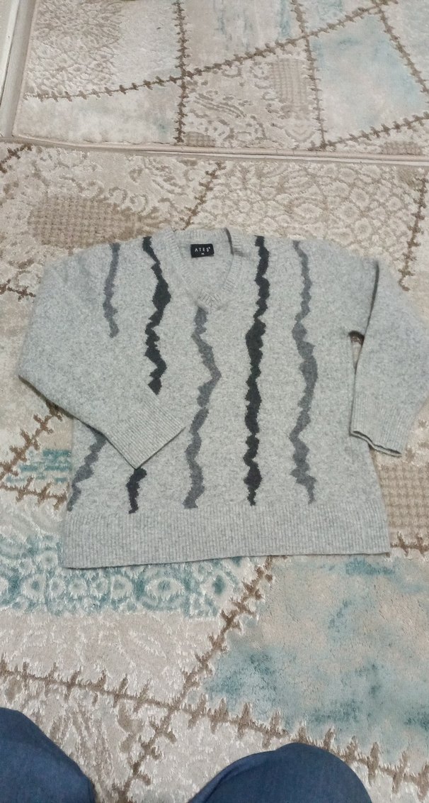 Gri renkte, bağlamalı desenli, uzun kollu V yaka, bol kesim kısa uzunlukta kadın triko kazak.