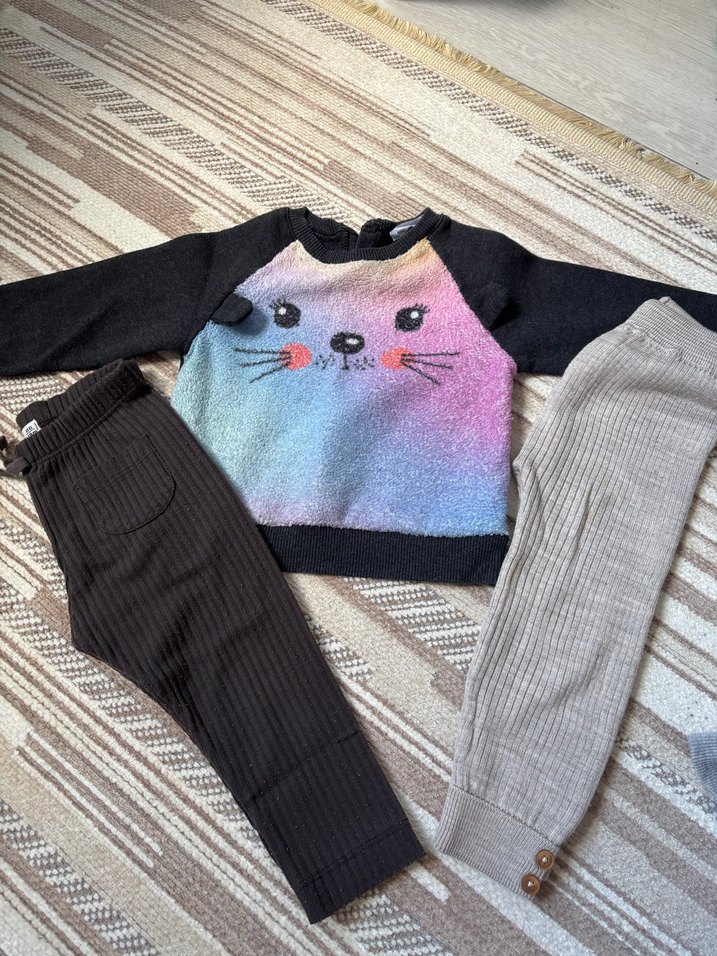 Bu bebek kız takımı, gri tonlarında bağlamalı desenli, örgü uzun kollu bir üst ve uyumlu renklerde rahat pantolonlar içerir.