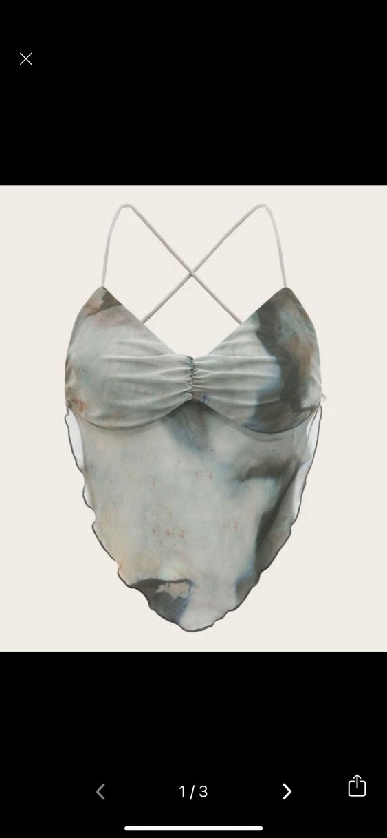 Gri bağlamalı halter yaka ve ince askılı, drapeli mini bustiyer. Yumuşak keten kumaştan, avant-garde ve karşı kültür tarzına uygun, parti için ideal.