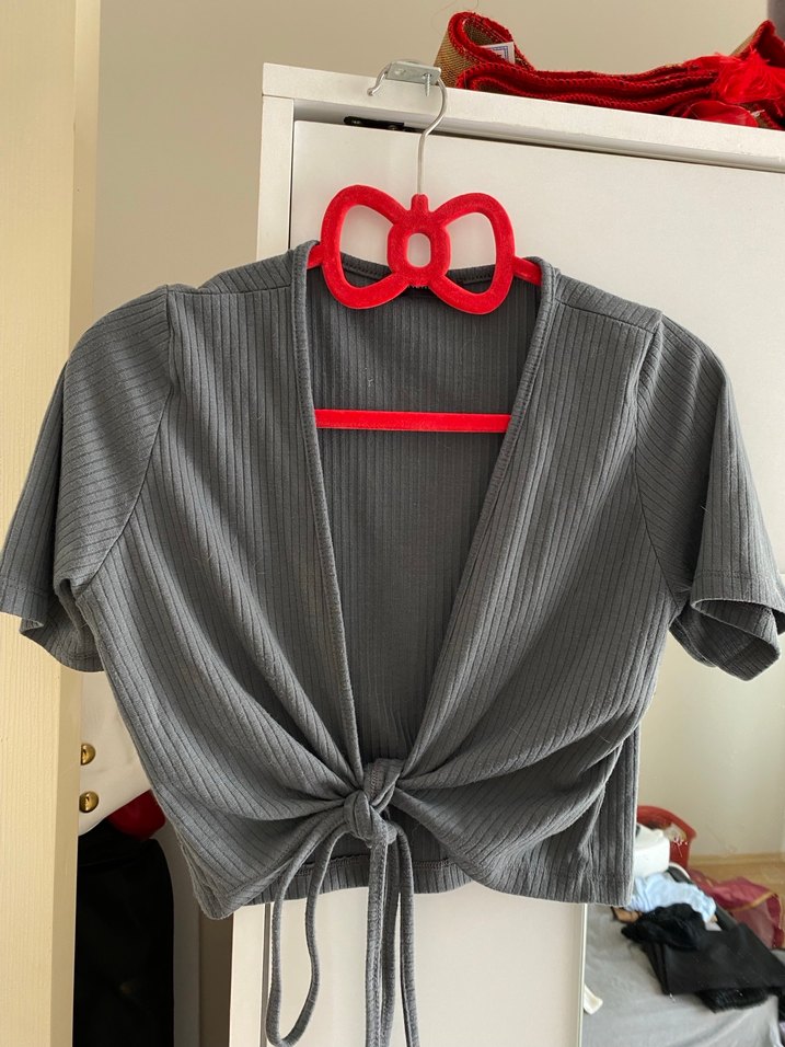 Gri renkte, halter yaka ve önde bağlama detayı bulunan üst normal boyda, yumuşak sentetik kumaştan, günlük rahat sokak stili için uygun.