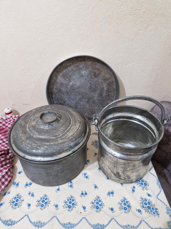 Kapaklı tencere, saplı kova ve yuvarlak tepsiden oluşan gri bakır mutfak seti.defosuz