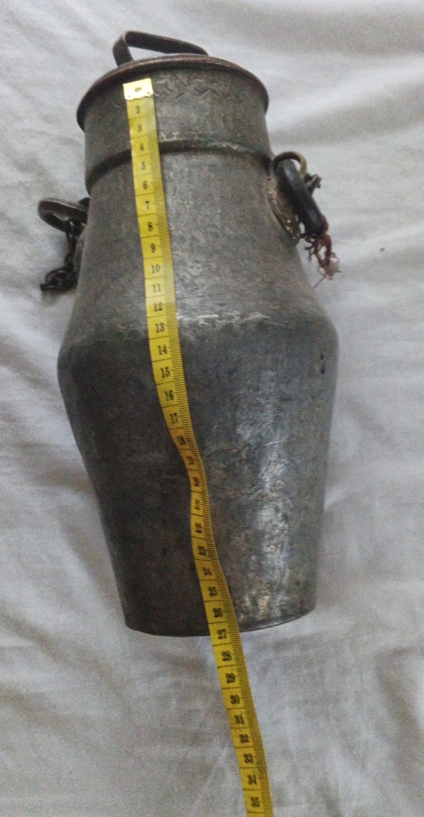 Yanlarında kulplar bulunan, yaklaşık 27 cm yüksekliğinde gri metal vazo. Rustik bir görünüme sahip.